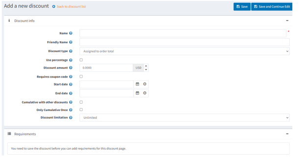 - Select a Discount type (assigned to: order total, products, categories, manufacturers, shipping, or order subtotal)