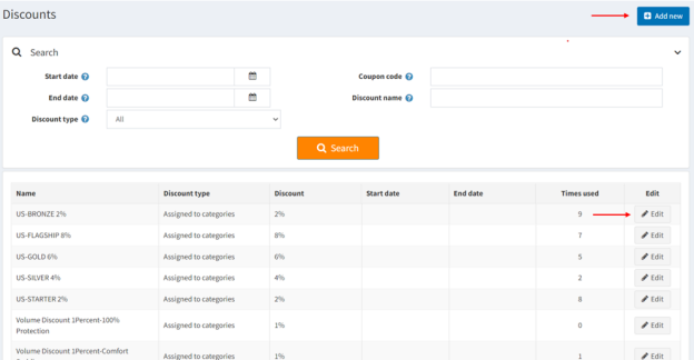 Select Promotions > Select Discounts > Add new or Edit an existing