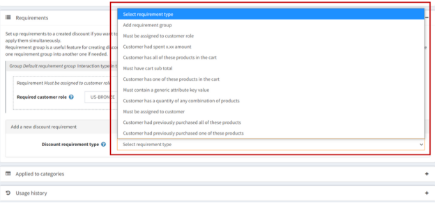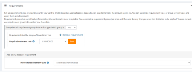 Set up requirements to a created discount if you want to limit it to certain user categories depending on a customer role, the amount spent, etc. You can use single requirement type, or group several types and apply them simultaneously.