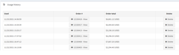 You may also browse by usage history and view when a discount was applied, the order number, and order total.