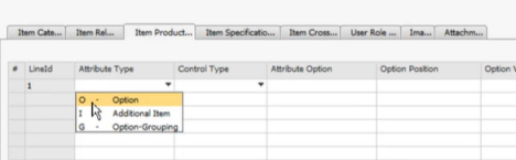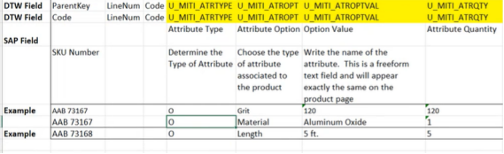 * For this tab you need to fill out any specifications * ParentKey – this is the SKU number * U\_MITI\_ATRTYPE – this is predefined in SAP * This can be checked in SAP in the FPItemConfig * The options for the attribute type are * O (option) * I (additional item) * G (option-grouping)