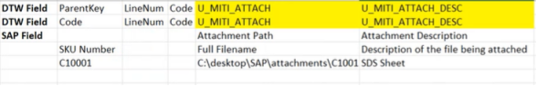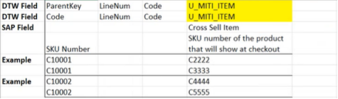 - If there are other details, you would like to include on the item header you need to manually add the field name to the item config in SAP and then add the column on the DTW template