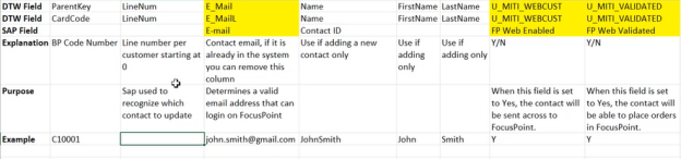 * OCPR – ContactEmployees – You can use this tab to fill out your Contacts. * For this tab we need; * The card code * We need a line number for the contacts * 1. Mohammed has a query to populate the line number * The contacts email address * 1. Only for new contacts, the email address is needed * 2. each contact can only have 1 email address * The contacts first name * 1. Only for new contacts, the first name is needed * The contacts last name * 1. Only for new contacts, the last name is needed * web enable y/n * web validated y/n