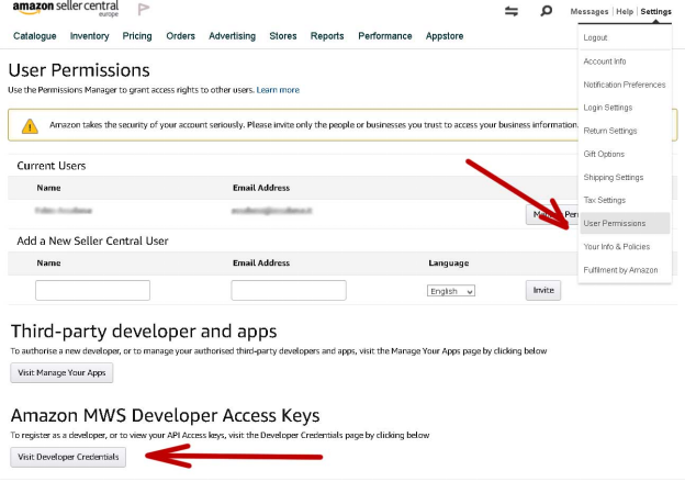 - Under Amazon MWS Developer Access Keys click the Visit Developer Credentials button.\