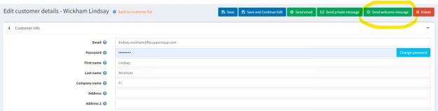 * OPTION 1: SEND TO AN INDIVIDUAL CUSTOMER * Go to the Customer panel and click ‘Edit’ to select the individual who should receive the Welcome Message * At the top of the customer profile, you will see a green button to ‘Send welcome message’ * Click that button to send the message to this one customer/individual
