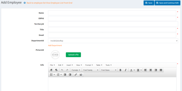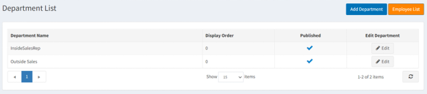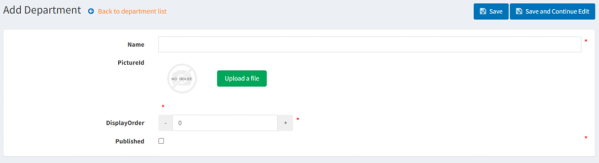 * * Fill out Name field, i.e. Sales Reps (required) * There is an option to add a PictureId to the department (not required) * There is an option to set the display order in which it appears on FocusPoint * To enable the department, check the box for Published * Click Save at the top of the page