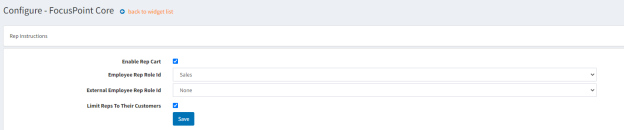 * Lastly, you will set the “Sales role” by going into FocusPoint 3.0.XX > Administration > Rep Settings and select ‘enable rep cart’, add ‘Sales’ to Employee Rep Role Id, and if you want to limit reps to their customers, enable the checkbox as well: