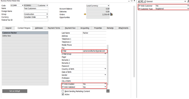* Open the User defined fields on the BP master by clicking View> User-Defined Fields- Change the FP Web Customer to Yes